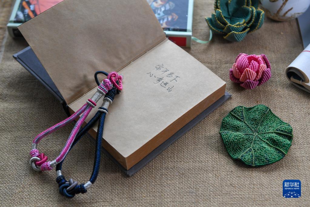 在位于吉林省长春市的徐晓雪工作室内展示的绳结工艺品(6月20日摄)。