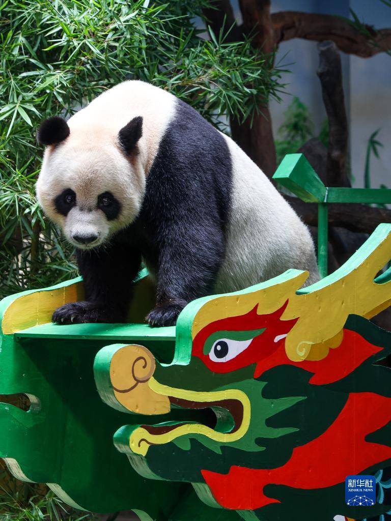 当日,广州长隆野生动物世界熊猫馆的10余只大熊猫迎来一个特别的端午节,它们与游客一起渡龙船、吃粽子,“体验”一把端午文化的氛围。
