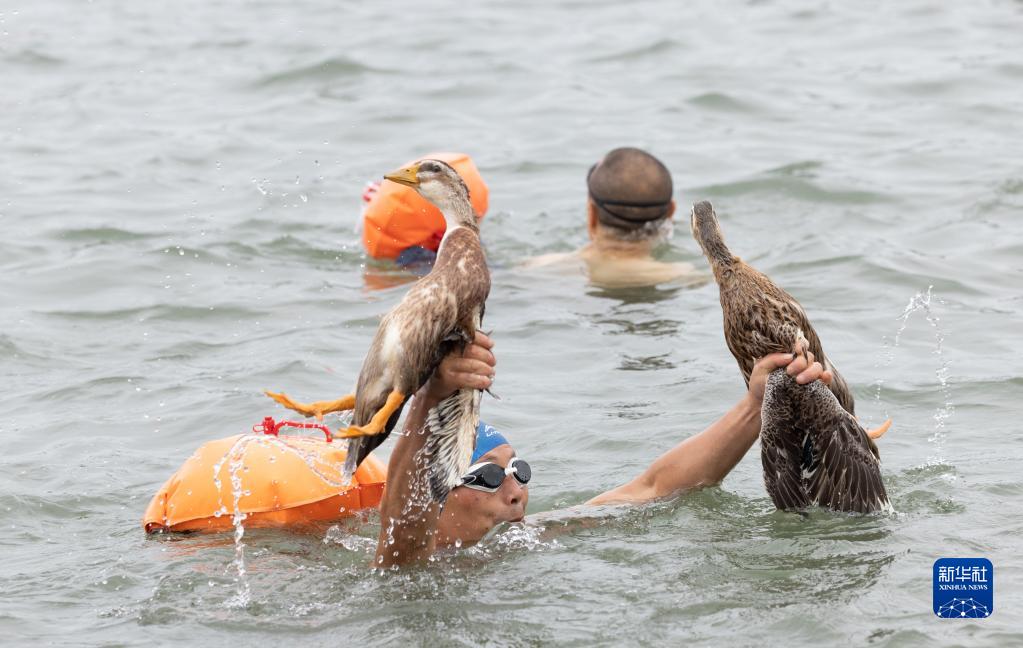 6月21日,四川省乐山市夹江县群众下河参与抢鸭子比赛。