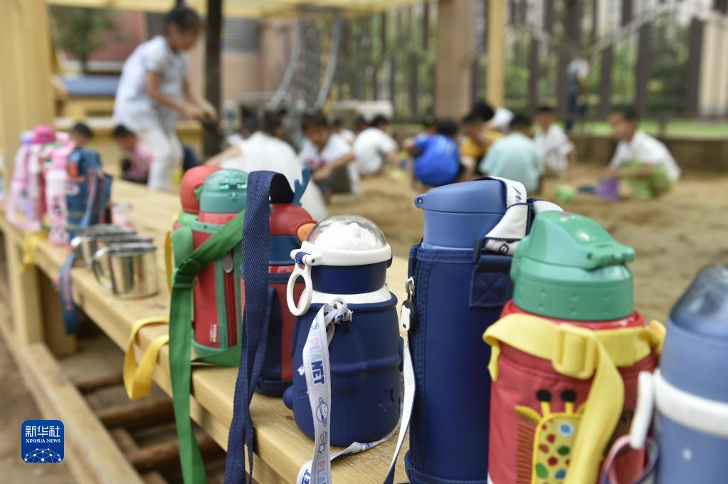 6月19日,在河南省郑州市奇色花福利幼儿园,普通儿童和特殊需要儿童一起参加户外活动。