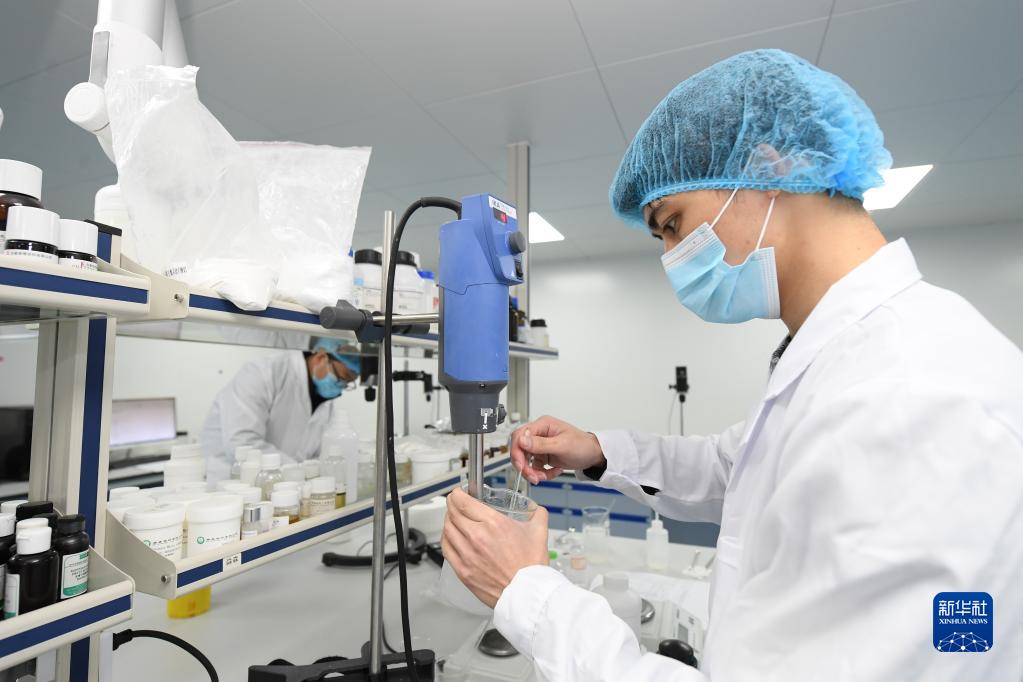 在埭溪镇美妆小镇一家化妆品企业,工作人员在实验室进行新产品的检测研发(2023年2月16日摄)。