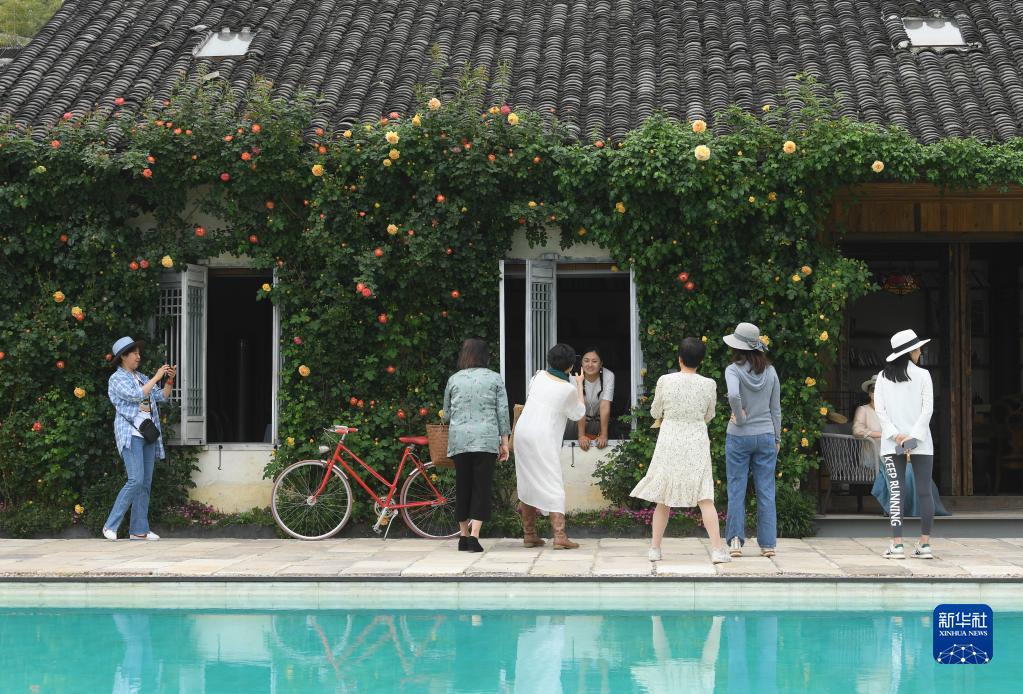 在埭溪镇莫家栅村的玫瑰庄园,参观者在玫瑰盛开的花墙前留影(2023年4月20日摄)。