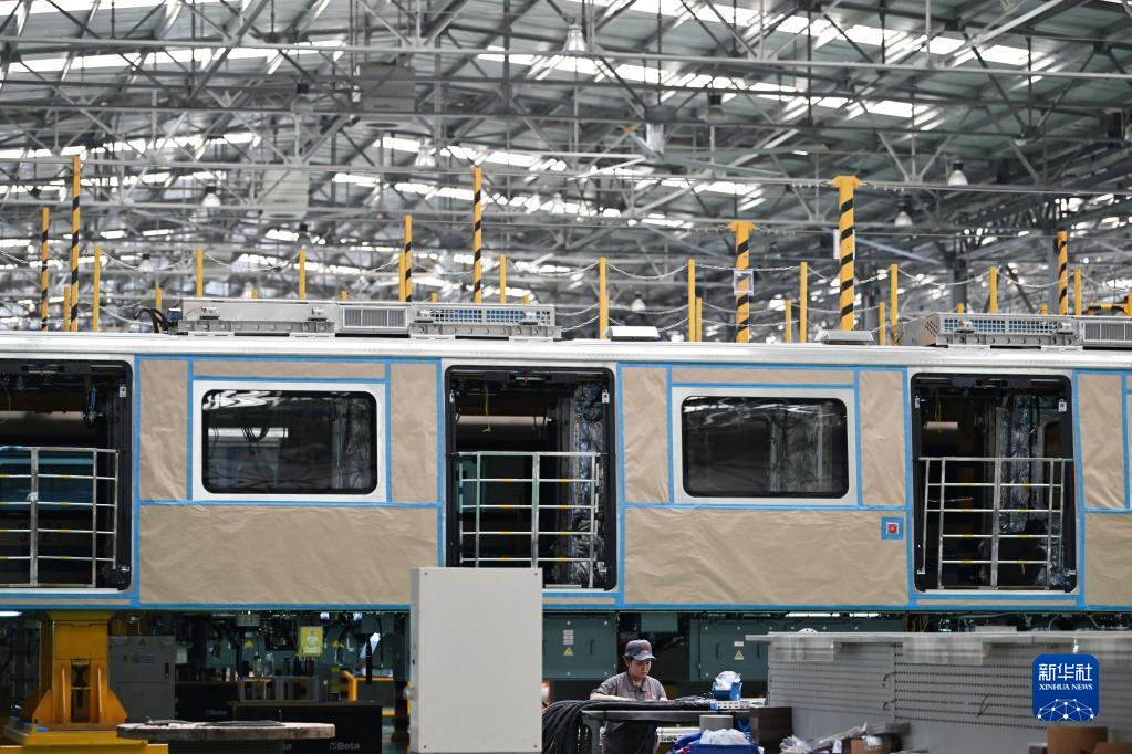 工作人员在天津中车唐车轨道车辆有限公司的组装车间内进行作业(6月20日摄)。