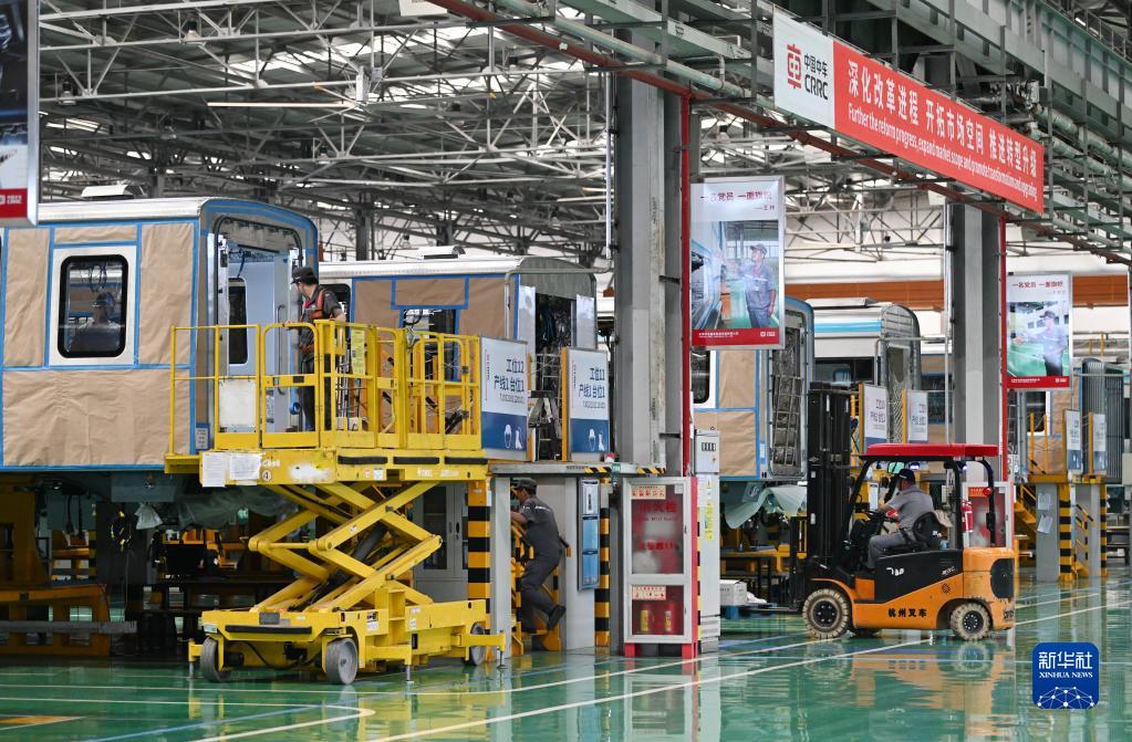 这是天津中车唐车轨道车辆有限公司组装车间内一景(6月20日摄)。