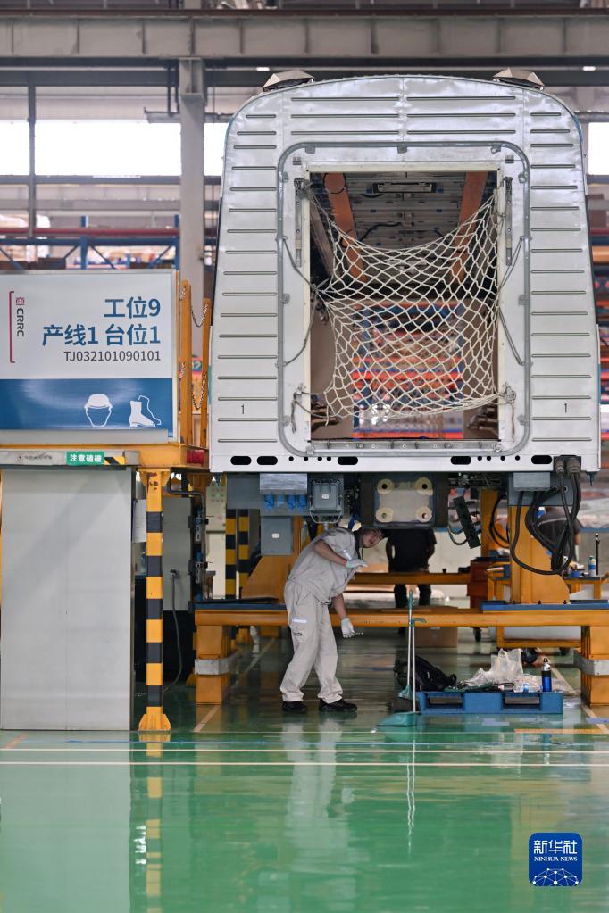 工作人员在天津中车唐车轨道车辆有限公司的组装车间内检查车底(6月20日摄)。