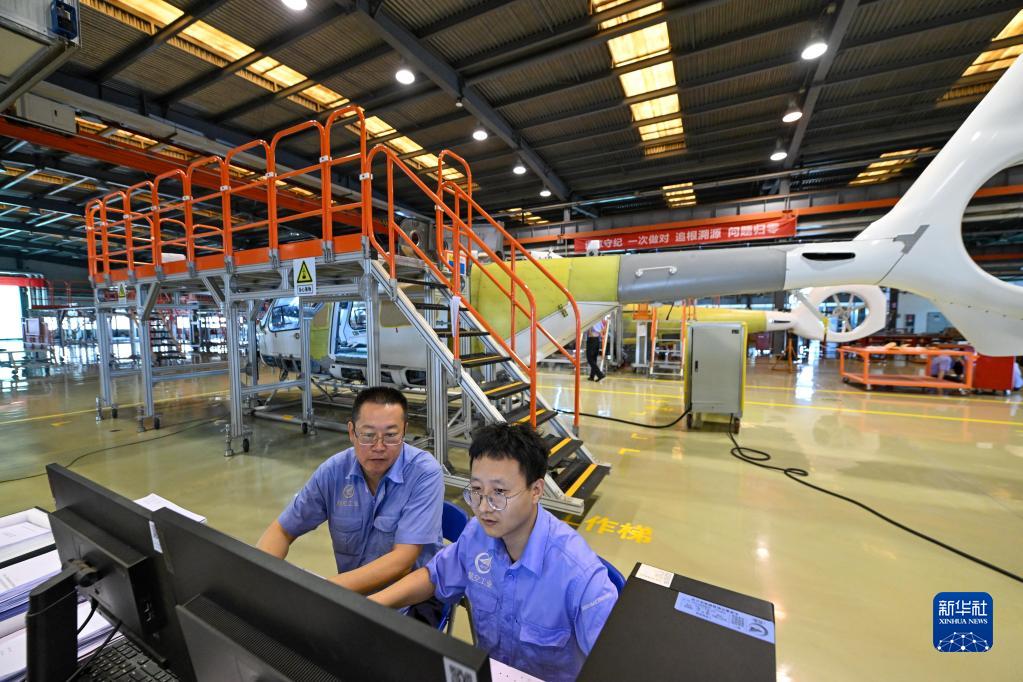 工作人员在航空工业天津直升机有限责任公司查看产品图纸(6月20日摄)。