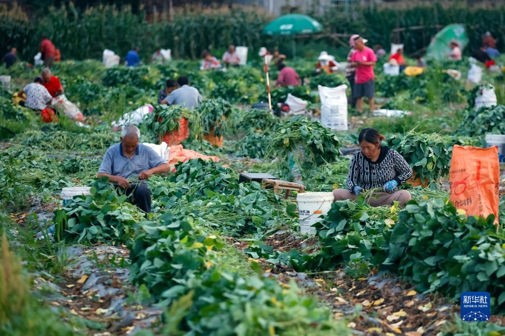 6月19日傍晚,人们在四川省成都市金堂县官仓街道双堰社区的田地里采收毛豆。