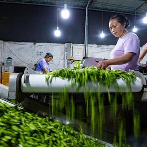 近日,官仓街道的毛豆进入收获期,等到下午气温适宜,收割大军就开始下地劳作。经过采收、挑选、清洗、再次分选等一系列步骤,新鲜毛豆通过冷库保鲜后装入冷链物流车运往全国各地。从下午到次日清晨,当地农民辛勤劳作,经历一个个不眠之夜,将田间的一捧毛豆变为人们餐桌上的一盘美食。