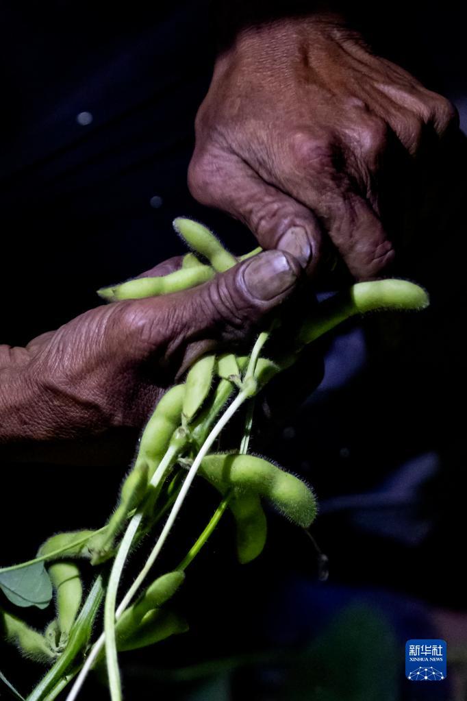 6月19日夜间,在四川省成都市金堂县官仓街道双堰社区的田地里,人们借助着灯光,抓紧时间采收毛豆。