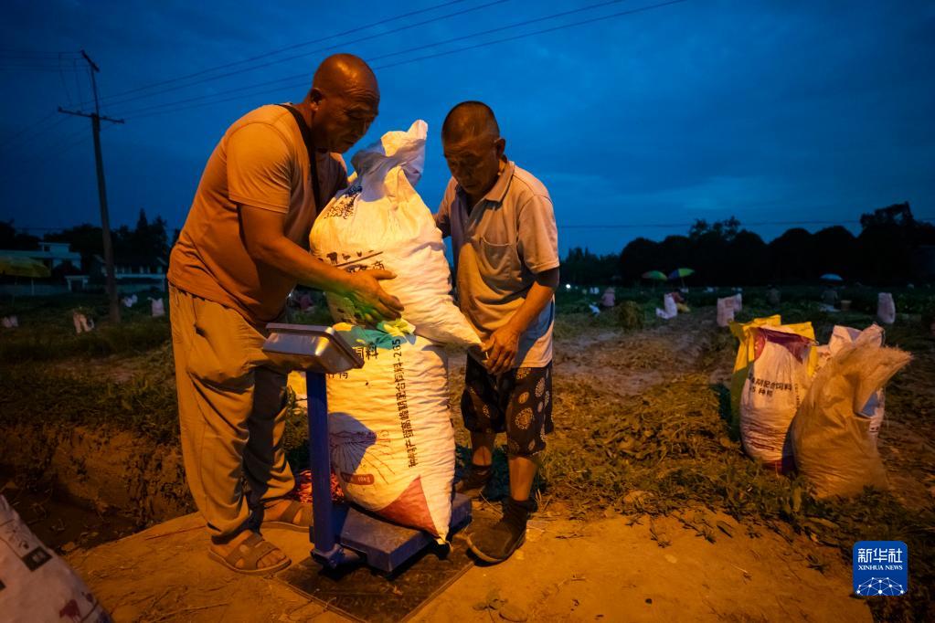 6月19日夜间,在四川省成都市金堂县官仓街道双堰社区,种植大户易大枪(左)在称量收获的毛豆。