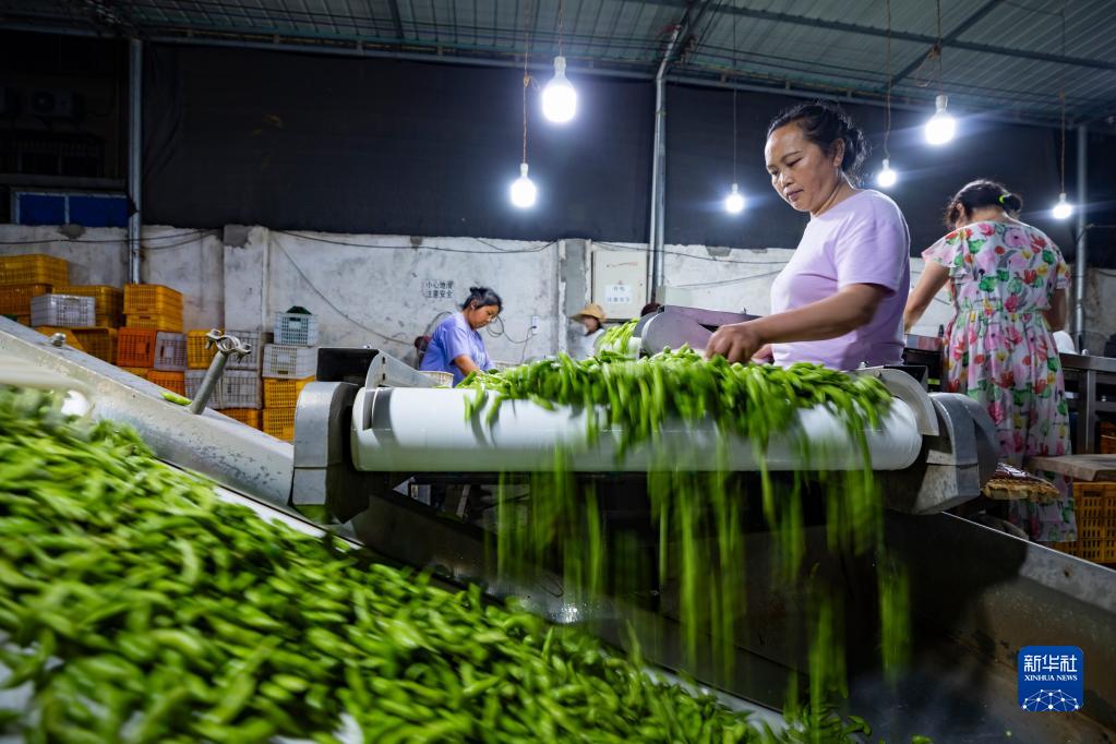 6月19日夜间,在四川省成都市金堂县官仓综合(果蔬)市场的流水线上,工人在筛选不符合外销要求的毛豆。