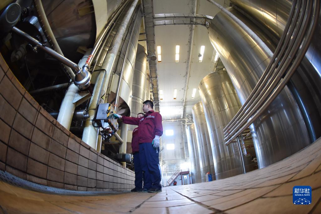 6月21日,在河北省怀来县长城葡萄酒厂,两名工人在储酒库里操作设备。