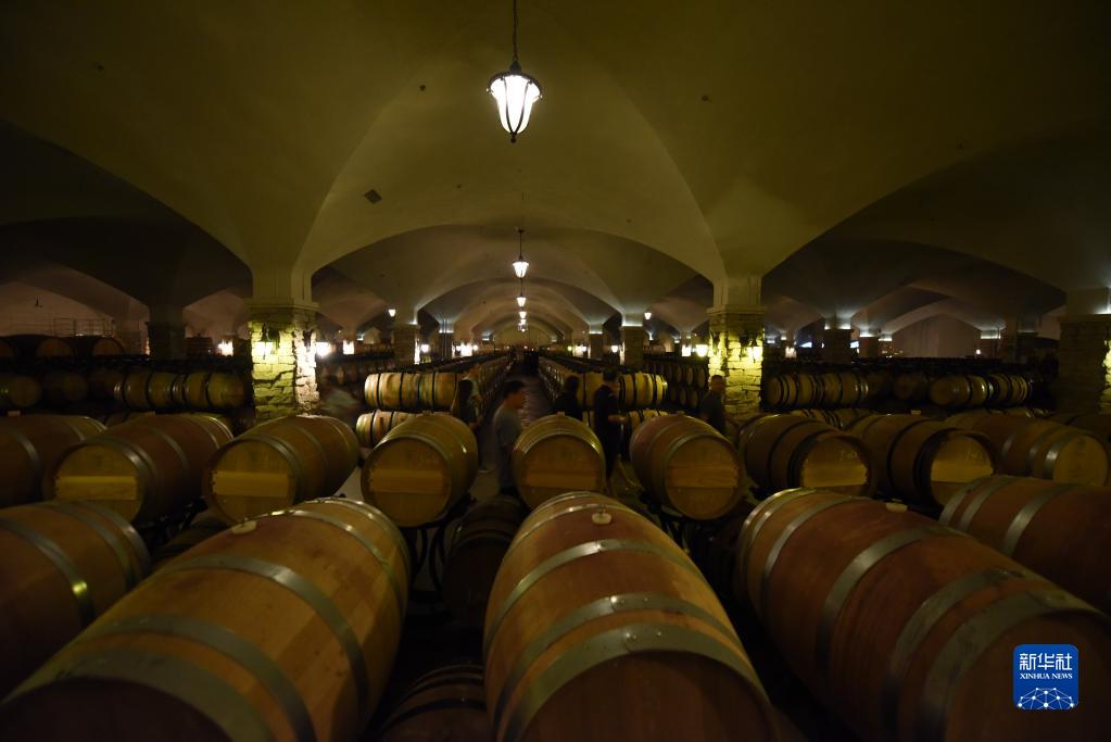 6月21日,在河北省怀来县长城桑干酒庄,游客在葡萄酒库中参观。