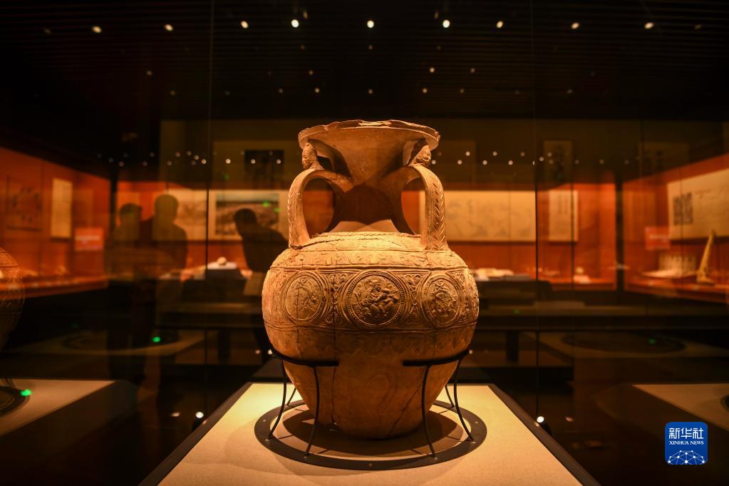 这是在新疆喀什地区博物馆拍摄的国家一级文物“三耳压花陶罐”(6月12日摄)。新华社记者 胡虎虎 摄