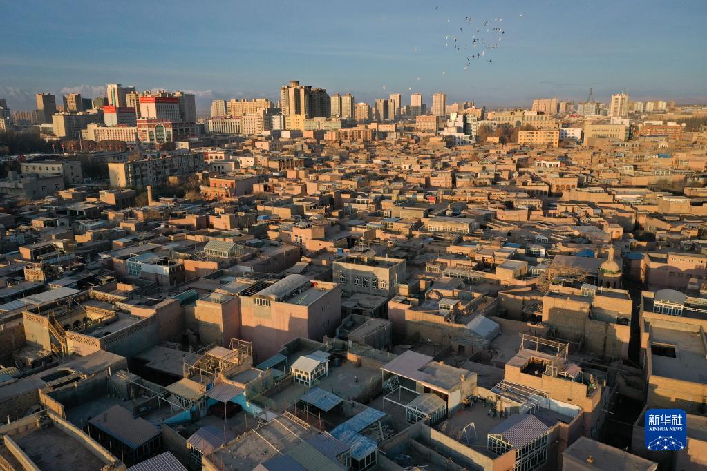 鸽群飞过喀什古城(3月10日摄,无人机照片)。新华社记者 李响 摄