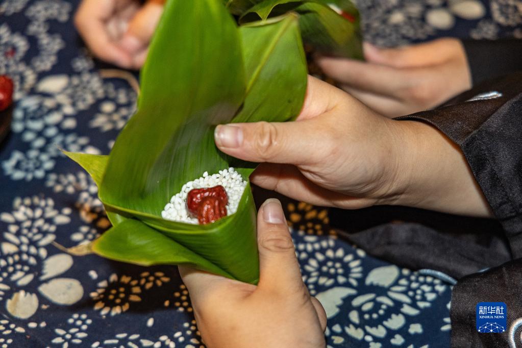 6月21日,在重庆市璧山区秀湖公园内的九门仙侠小镇,游客在体验包粽子。
