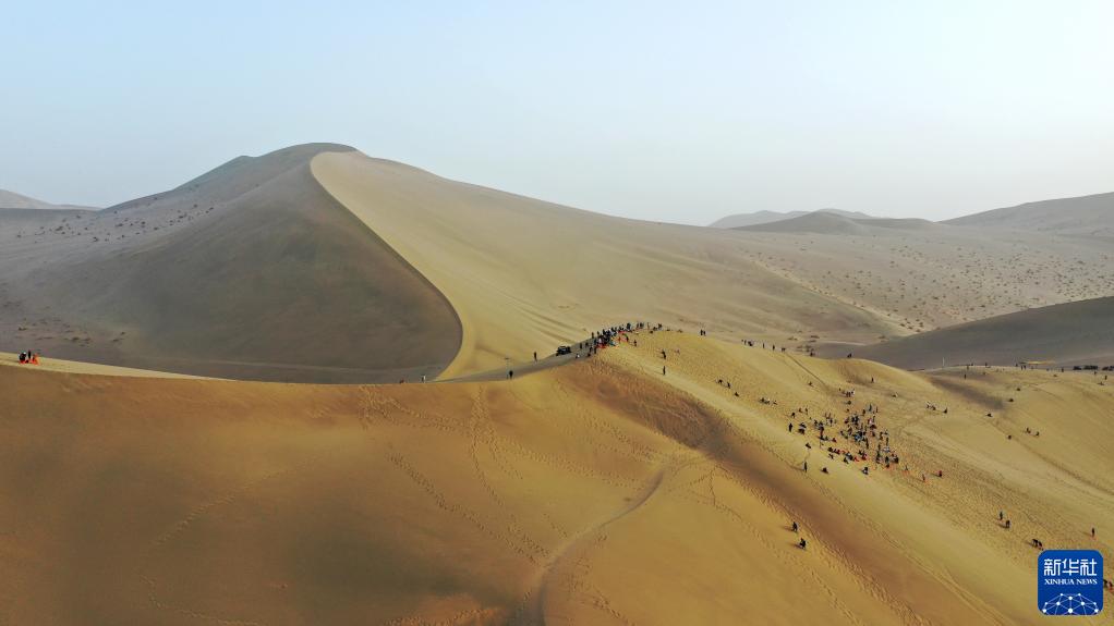 游客在敦煌鸣沙山上游玩(4月24日摄)。