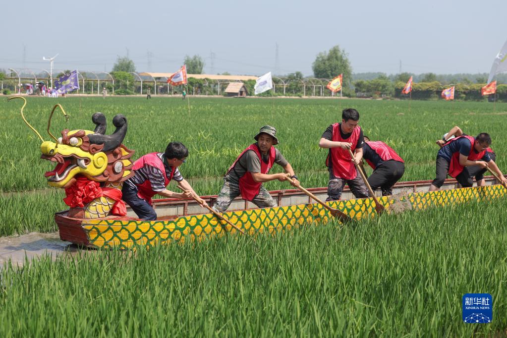 6月22日,参赛者在沈阳市沈北新区兴隆台锡伯族镇稻田的泥地中划龙舟。