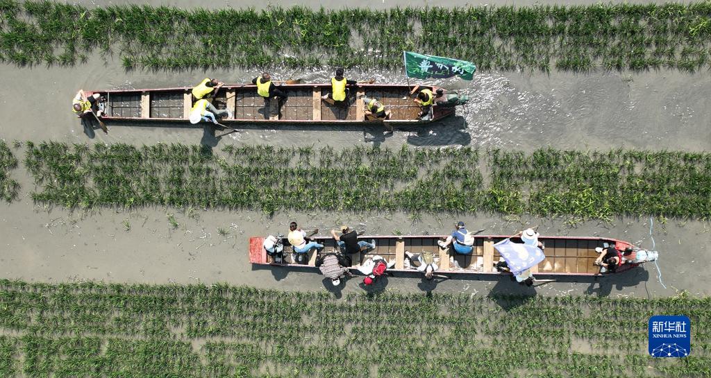 6月22日,参赛者在沈阳市沈北新区兴隆台锡伯族镇稻田的泥地中划龙舟 (无人机照片) 。
