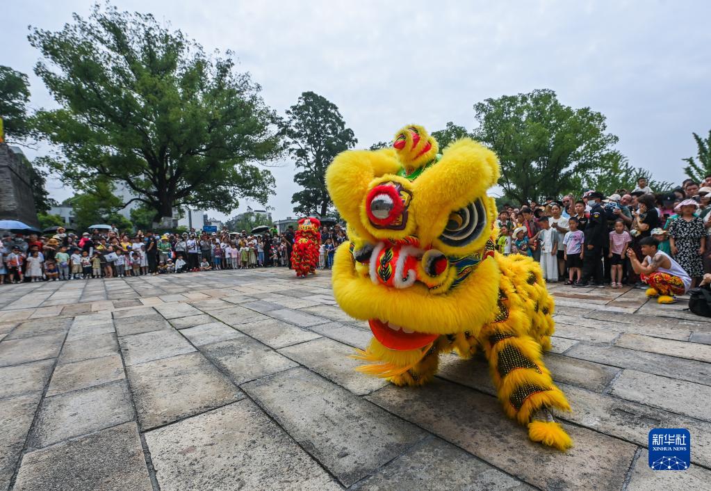 这是6月22日在浙江嘉兴子城遗址公园广场拍摄的舞狮表演。