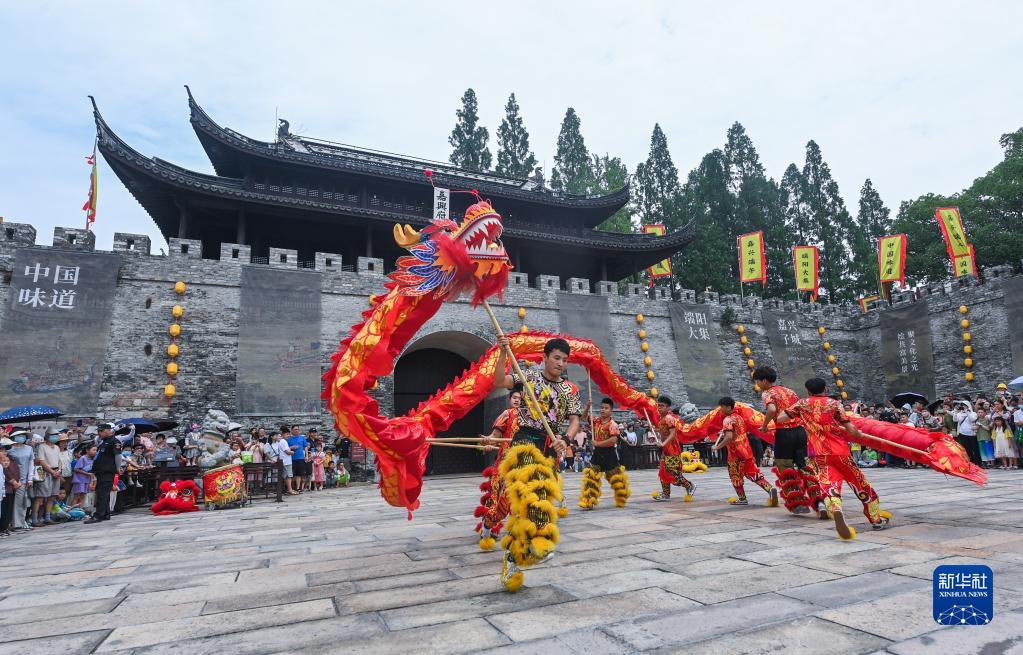 这是6月22日在浙江嘉兴子城遗址公园广场拍摄的舞龙表演。