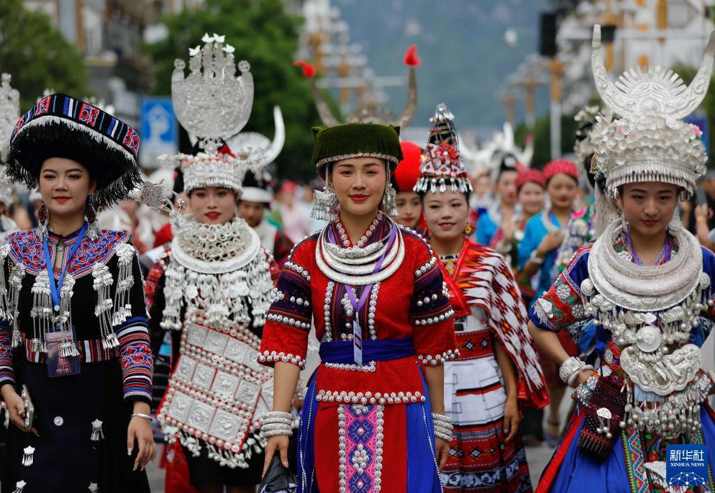6月22日,在贵州省黔东南苗族侗族自治州施秉县举行的独木龙舟节上,少数民族同胞身着盛装进行巡游。