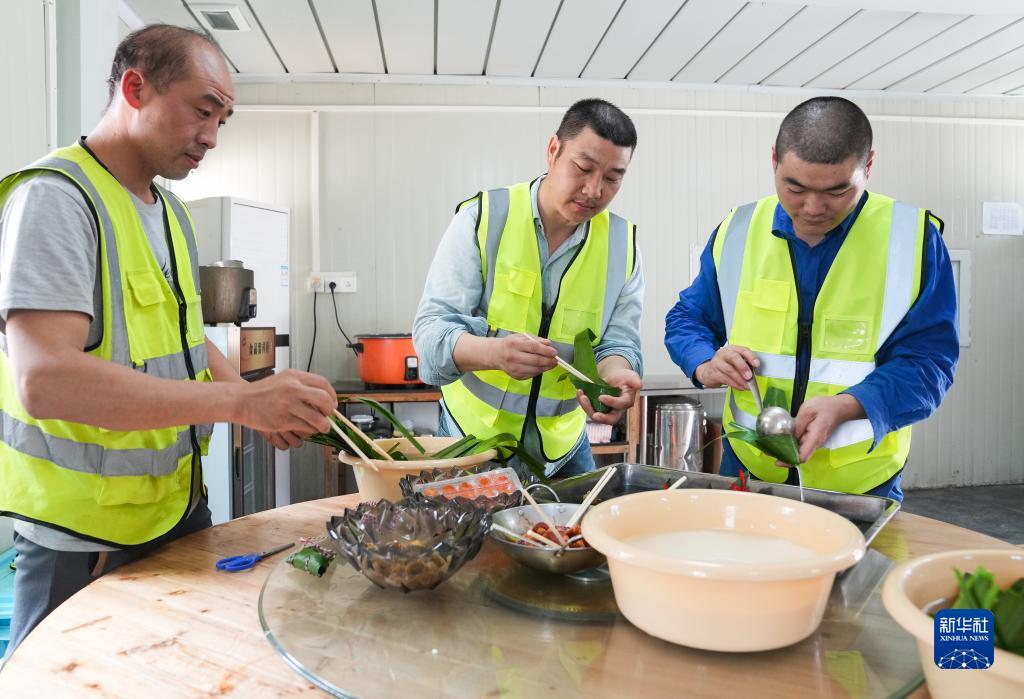 6月22日,中建三局一公司安装公司工人在上海一处项目工地食堂包粽子。