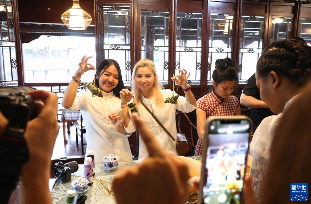 6月22日,在上海青浦朱家角古镇,留学生在包粽子活动现场展示粽子。