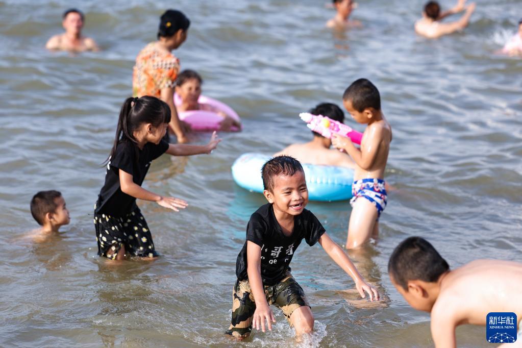 6月22日,小朋友在海口假日海滩“洗龙水”。