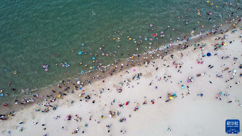 6月22日,人们在海口假日海滩“洗龙水”(无人机照片)。