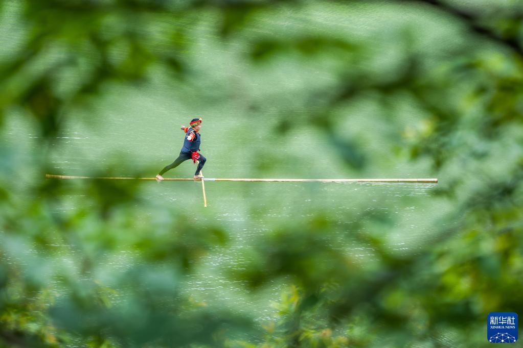 6月22日,独竹漂表演者在贵州省毕节市九洞天景区表演。