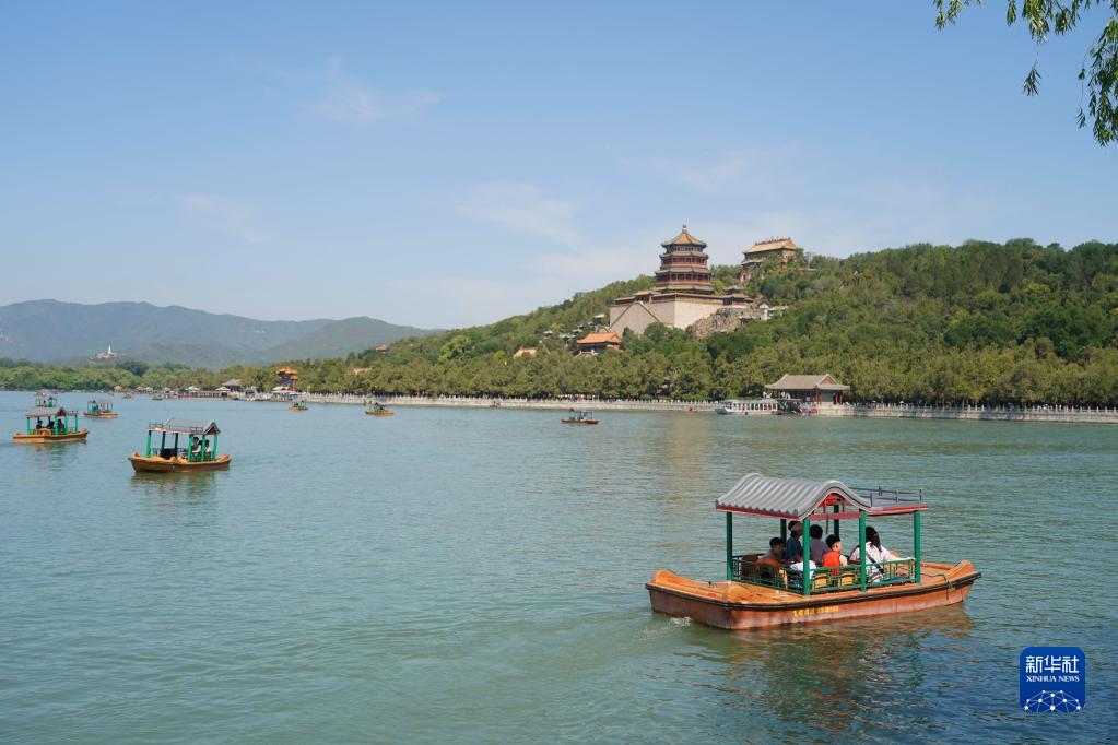 6月22日,游人在北京颐和园乘坐游船。