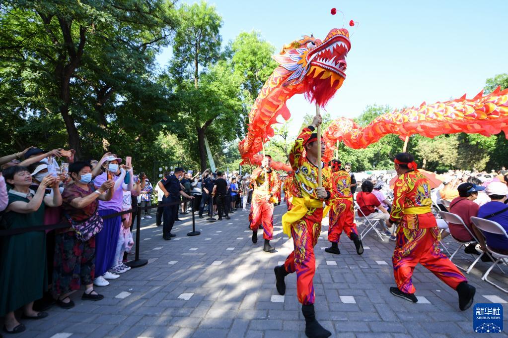 6月22日,游客在北京龙潭湖公园欣赏舞龙表演。