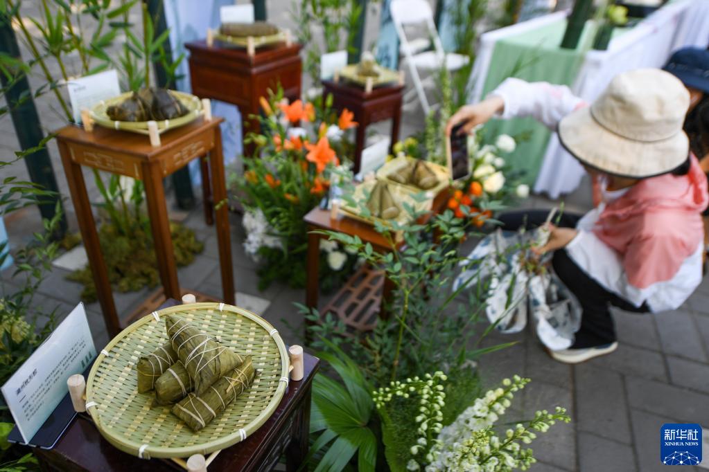 6月22日,游客在北京龙潭湖公园观看展出的各类粽子。