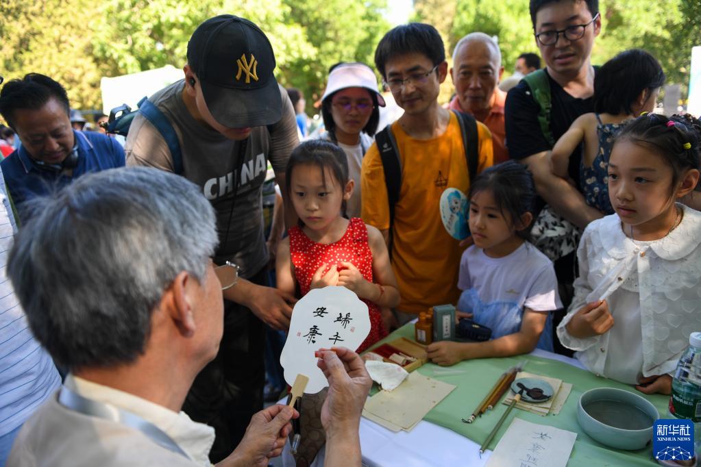 6月22日,一位书法家在北京龙潭湖公园为小朋友书写“端午安康”的扇面。
