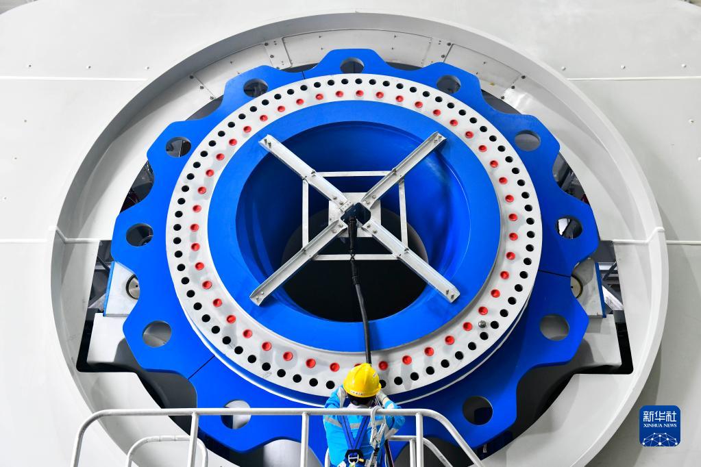 6月21日,在乳山市远景能源零碳产业园,工作人员在海上风机前作业。