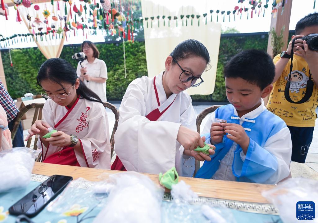 6月22日,孩子们在嘉兴端午民俗文化节的端阳大集上学习做香囊。