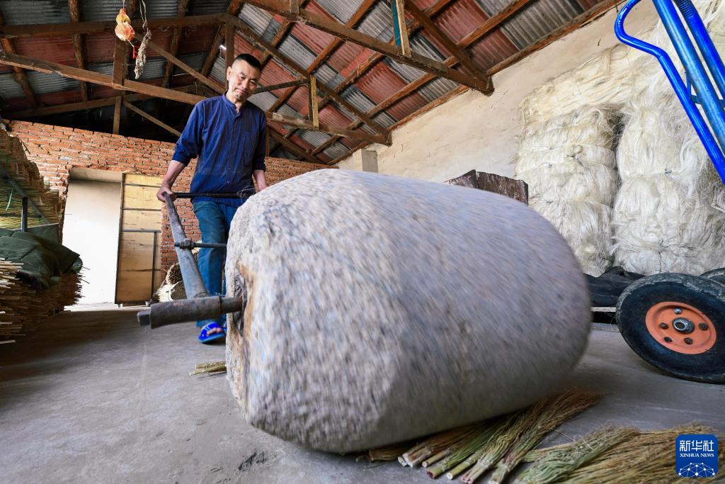 荣凤明使用石碾碾压工艺笤帚编制使用的原材料(6月21日摄)。