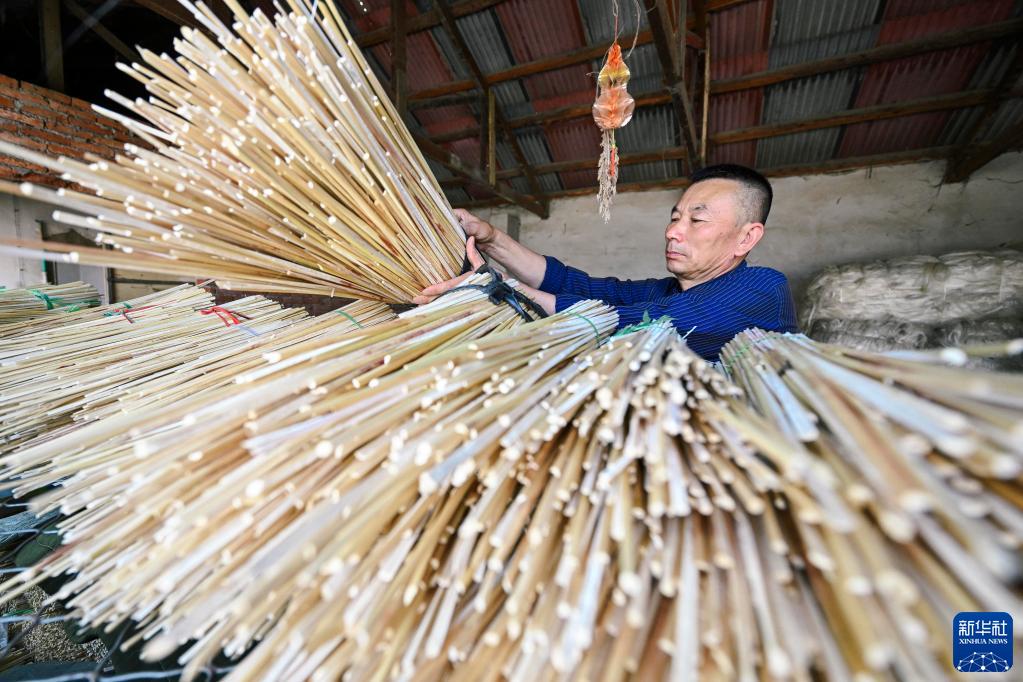 荣凤明在库房中整理工艺笤帚编制使用的原材料(6月21日摄)。