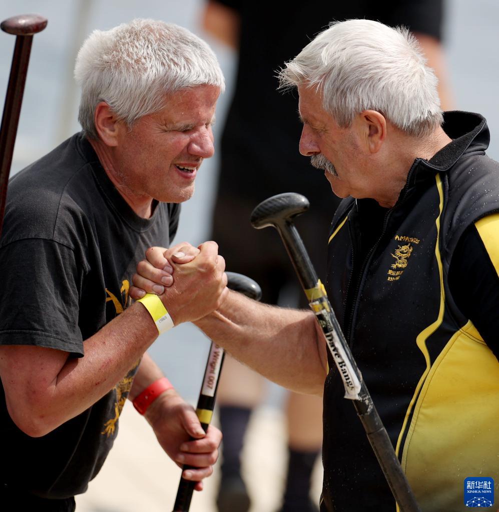 6月18日,在英国索尔福德市2023年全英中华端午龙舟会专业组比赛后,戴维·邦斯(右)感谢一位有视力障碍的团队成员。