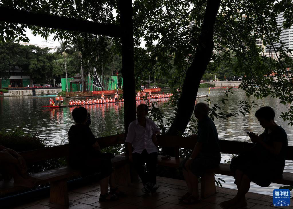 6月22日,在广州荔枝湾,市民观看泮塘龙船在为盐步老龙前来“探亲”做准备。