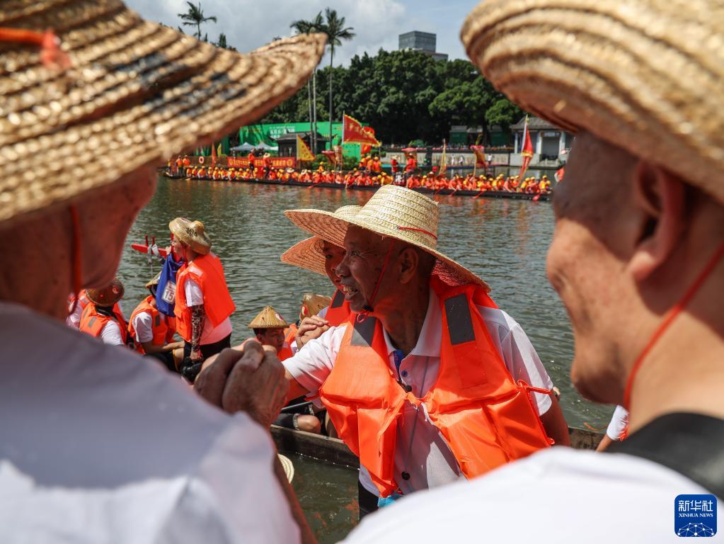 6月22日,佛山盐步老龙上的盐步老乡和广州荔枝湾泮塘老乡互致问候。