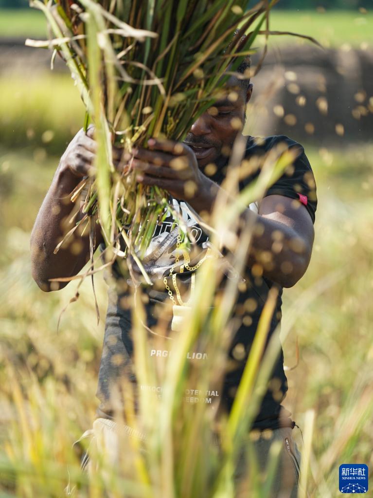 6月20日,在布隆迪布班扎省基航加县,农民在田间给杂交水稻脱粒。