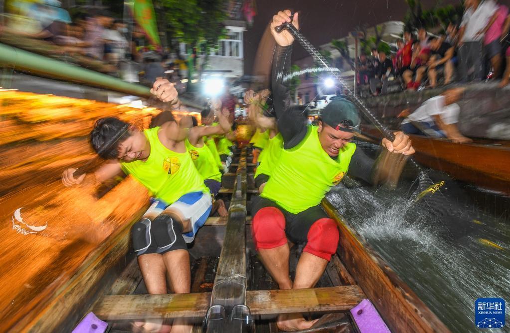 佛山叠滘东胜村的“扒仔”(桨手)在端午前坚持每天夜晚训练,以求能在端午龙船漂移赛中展示最佳状态(6月16日摄)。