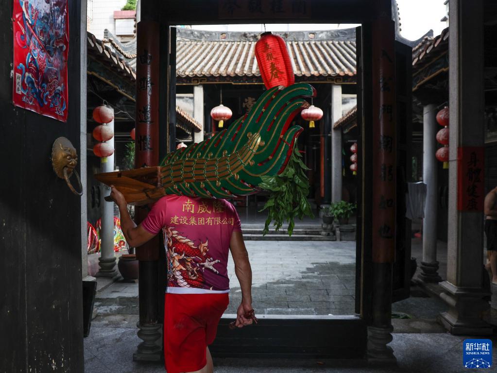 6月22日,佛山叠滘端午龙船漂移赛结束后,“扒仔”(桨手)将龙船的龙头龙尾请回家族祠堂保管。