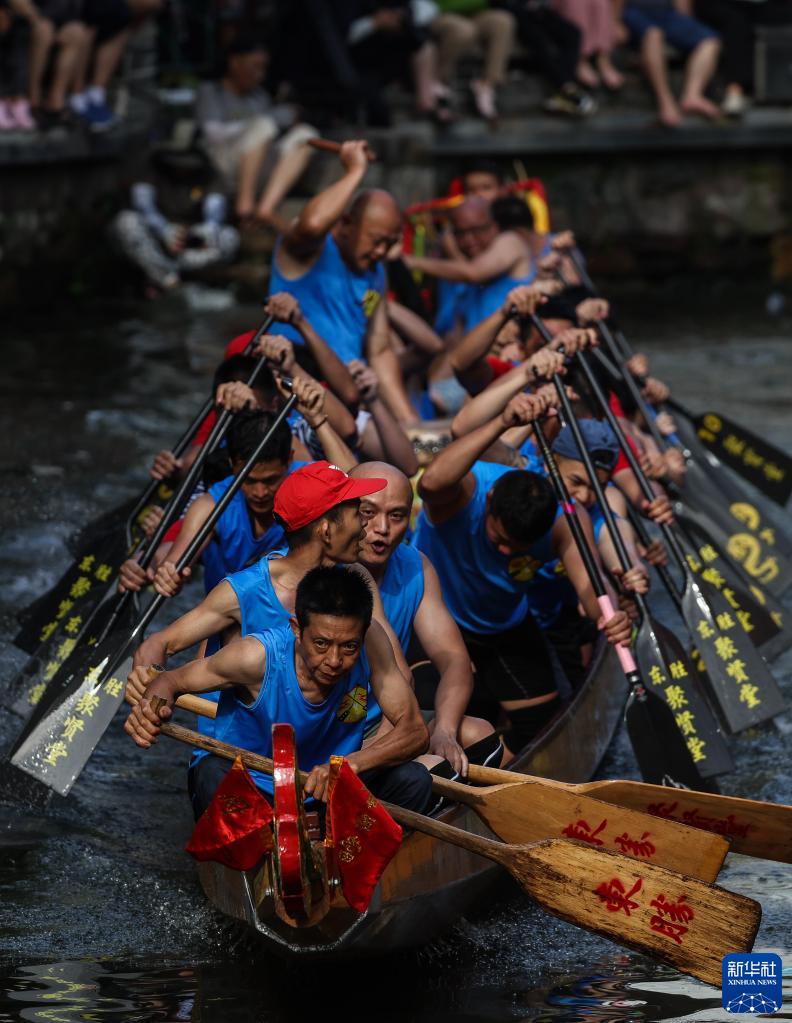 6月22日,“扒仔”(桨手)在佛山叠滘端午龙船漂移赛奋力挥桨,而舵手则稳坐在船头船尾。