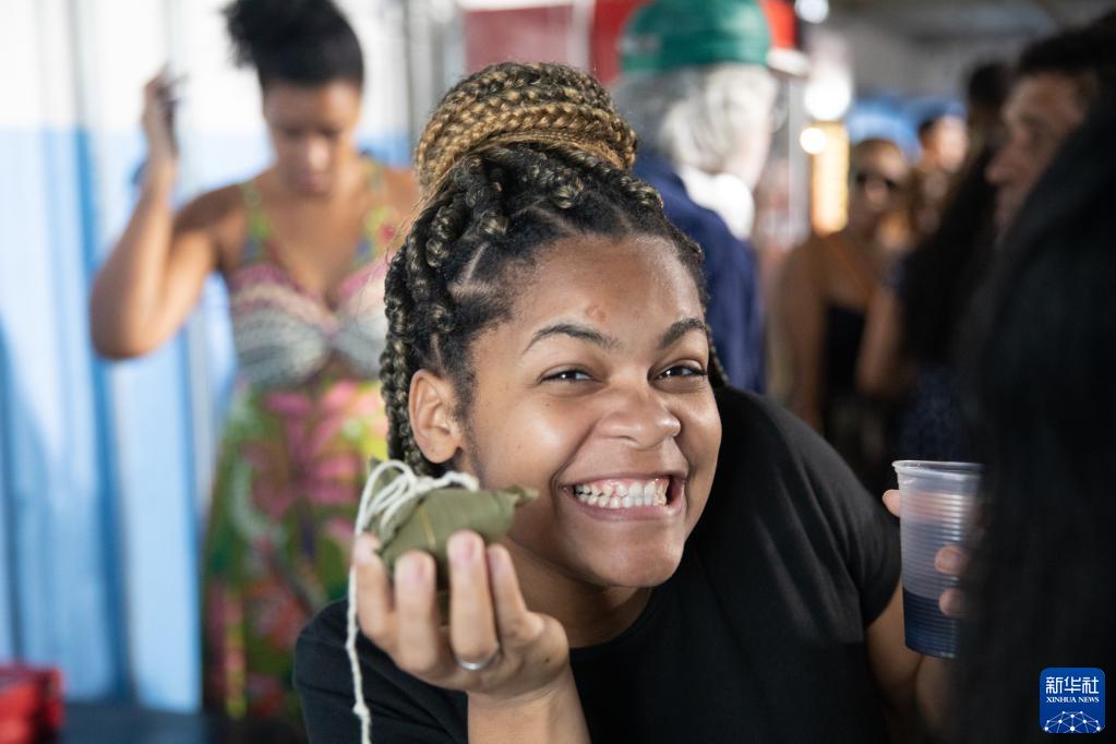 6月18日,在巴西里约热内卢圣玛尔塔社区,一名居民展示领到的粽子。端午节前,巴西中国浙江商会为圣玛尔塔社区居民带来200多份基础食物篮和200多个粽子,共同感受中国传统佳节的气氛。