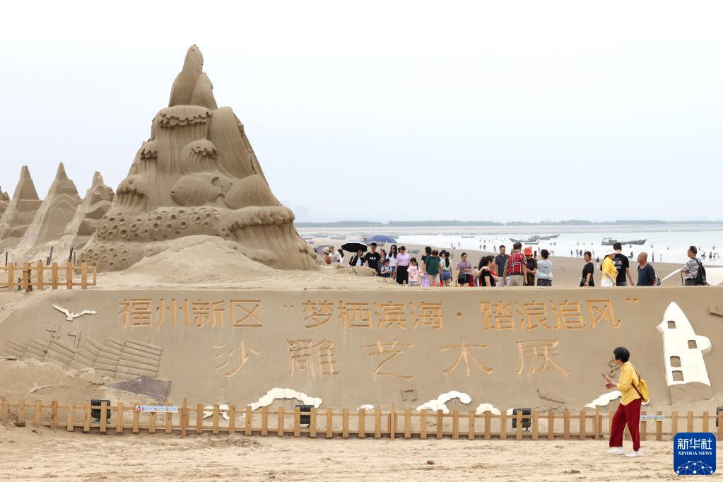 6月23日,游客在福州市长乐区江田镇下沙海滨度假村观看沙雕艺术展。