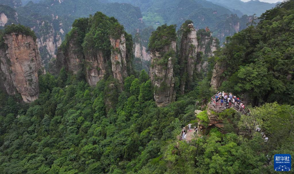 6月23日,游客在湖南张家界国家森林公园黄石寨游览(无人机照片)。