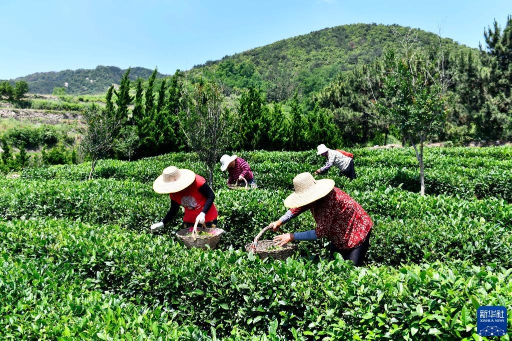 6月23日,在乳山市极北茶叶种植合作社大孤山镇基地,茶农在采摘鲜茶。该合作社带动周边200多位村民就业增收。